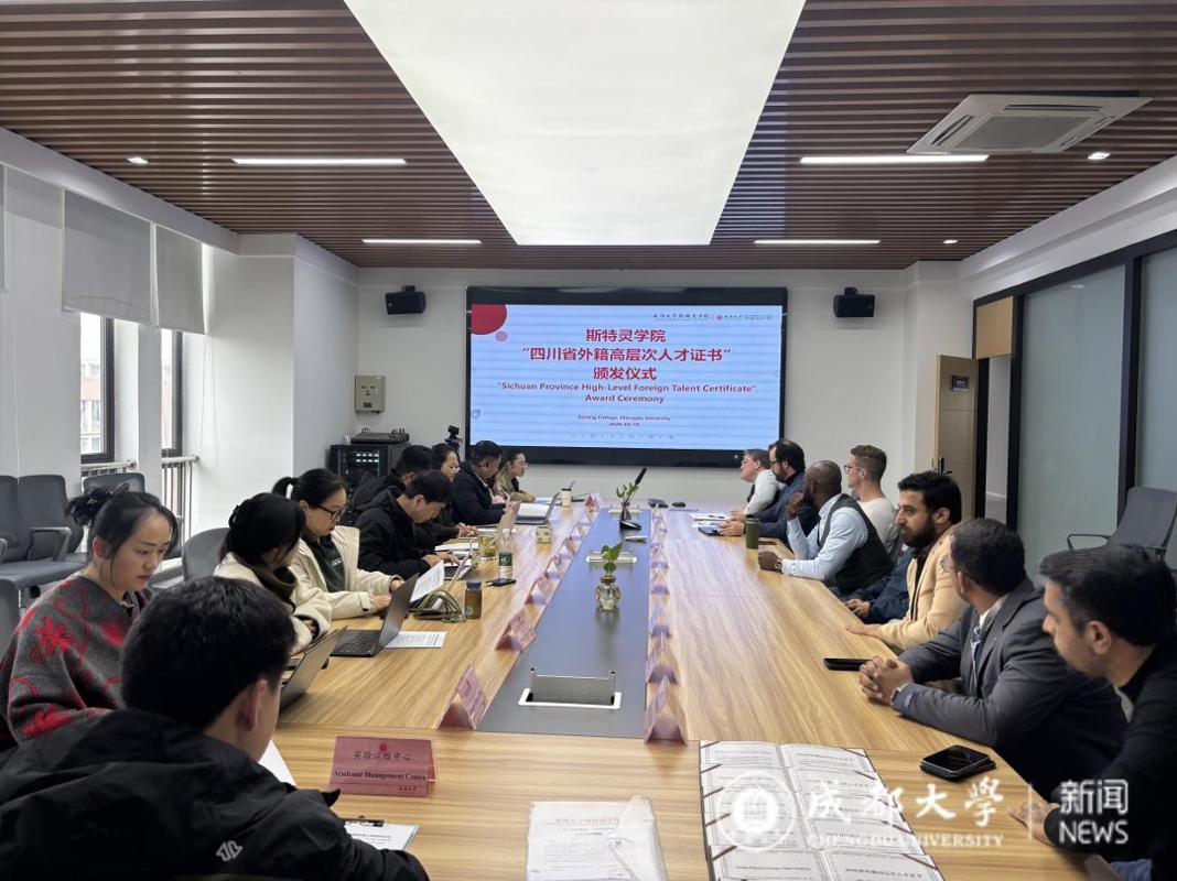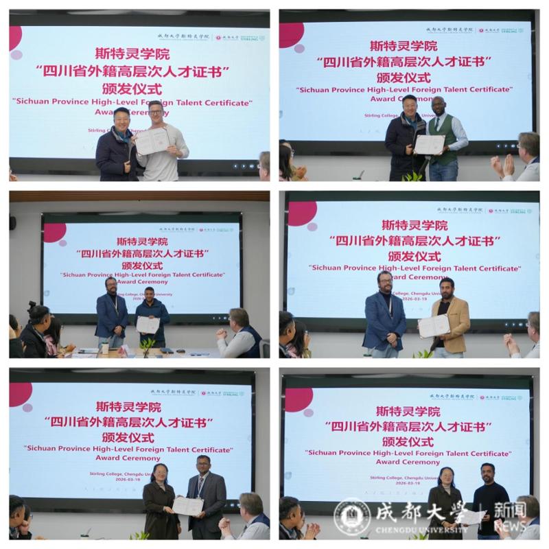 2026年3月19日,斯特灵学院在14521会议室举行“四川省外籍高层次人才”证书颁发仪式,为学院获得该人才称号的外籍教师颁发证书。学校国际合作与交流处外籍人员管理服务科廖菁应邀出席,学院党总支书记刘亚玲、院长于曦、英方执行院长Alvaro Collar Campos、学院党总支副书记郝巍、副院长王珏殷,各中心(办公室)负责人及获奖外籍教师出席仪式,仪式由学院全球交流办公室负责人张冬野主持。