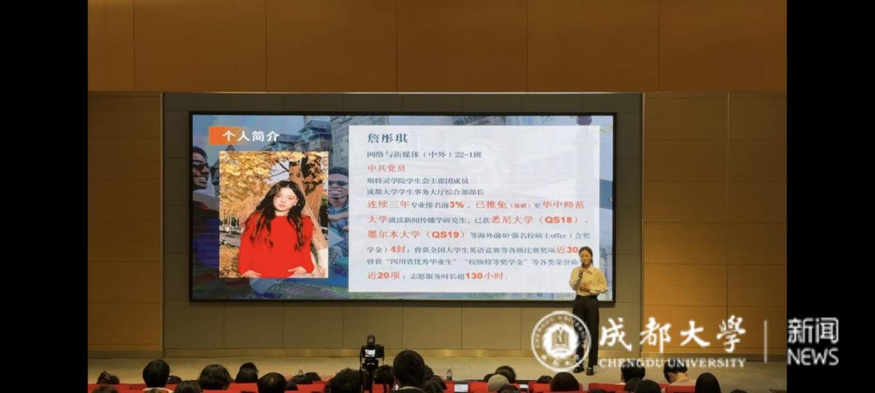 近日,成都大学2026年“‘青春·蓉光’十佳大学生”评选活动圆满落幕。斯特灵学院2022级网络与新媒体(中外)专业学子詹彤琪凭借卓越表现,从全校21个学院的优秀候选人中脱颖而出,斩获“十佳大学生”荣誉称号。