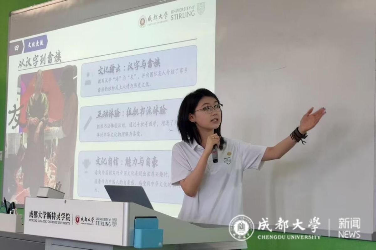 分享会上,柳玥言以PPT和视频形式,生动讲述了科考一线的实践经历。从浮游动植物与底栖动物的采样分类,到CTD、ROV、HOV等科研设备的学习操作,她与来自哈佛大学、北京大学、清华大学等高校的同学们混合编组,在科研任务中密切协作。作为队伍中具备新媒体专业背景的成员,她主动承担纪实拍摄任务,用镜头记录团队协作的珍贵画面。航行之外,她教外国同学写汉字、介绍畲族文化、组织书法体验,与多所高校的同学交换文化衫,在跨文化交流中搭建友谊之桥。