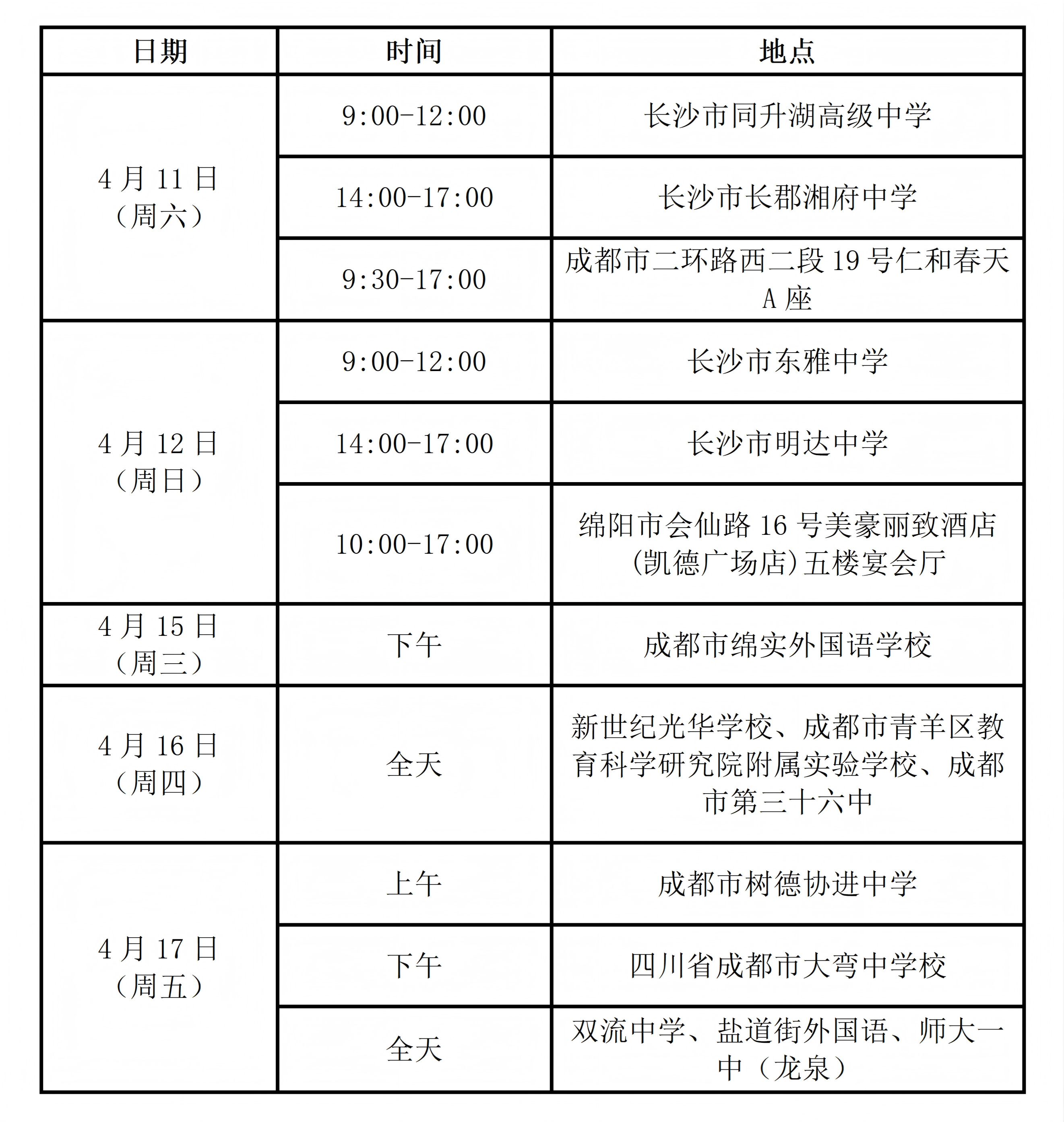 2026年4月11日—17日,成都大学斯特灵学院将在湖南省长沙市、四川省成都市、四川省绵阳市等地开展本科招生宣传咨询活动,为考生和家长现场介绍招生专业、解答招生政策。 具体安排如下: