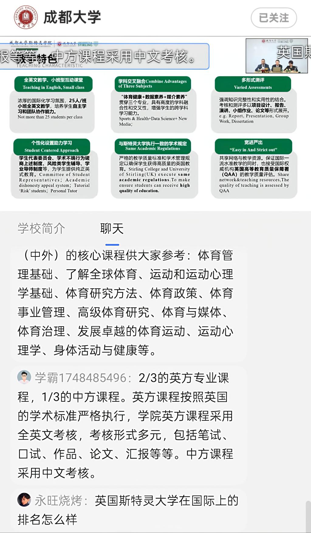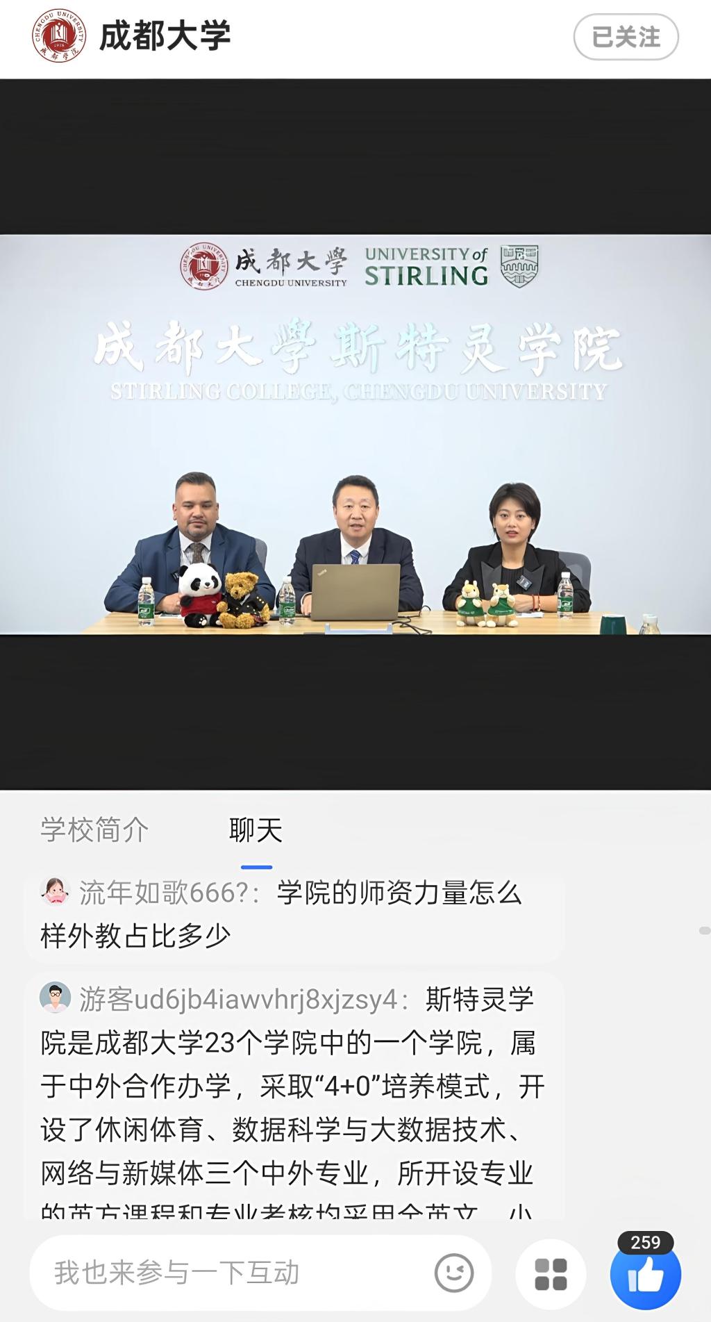 于曦院长通过高招云平台向广大考生及家长系统阐释了成都大学办学优势,以图文并茂的形式全方位展示了斯特灵学院的办学定位、学制特色、毕业去向、人才培养目标、专业优势、录取原则、招生情况和学院环境等。英方执行院长Waseem Ahmed Abbasi和朱梦婕老师重点分享了国际师资队伍建设成果,深度阐述了创新教学体系、国际化办学战略布局、以学生为中心的服务理念及跨文化管理体系。