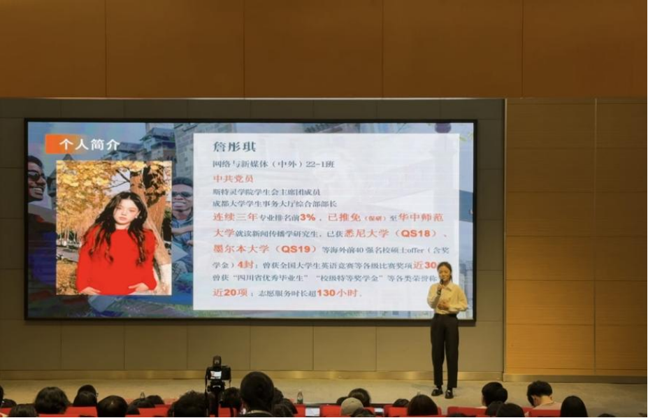 2026/04/16近日,成都大学2026年“‘青春·蓉光’十佳大学生”评选活动圆满落幕。斯特灵学院2022级网络与新媒体(中外)专业学子詹彤琪凭借卓越表现,从全校21个学院的优秀候选人中脱颖而出,斩获“十佳大学生”荣誉称号。4月14日下午,评选活动在新图书馆一楼报告厅举行。詹彤琪作为第18位候选人登台展示,她以充实的大学生活经历、丰硕的成长成果和真挚的情感表达,全面展现了斯特灵学子的青春风采与综合素养,赢得现场评委与观众的高度认可。最终,她以综合得分91.37分的优异成绩荣获“十佳大学生”称号。...